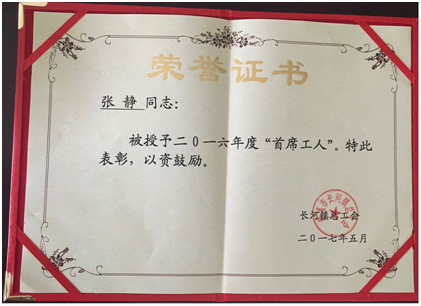 为充分发挥全镇职工在建设“人文小镇 品质长河”中的主力军作用,进一步深化“工人先锋号”创建活动,激励广大职工爱岗敬业、创新创造、学赶先进、争创一流,根据《慈溪市工人先锋号创建和评选管理办法》, 在开展2016年度长河镇“工人先锋号”评选活动中,公司荣获2016年度长河镇“工人先锋号”,张静同志被授予2016年度“首席工人”。